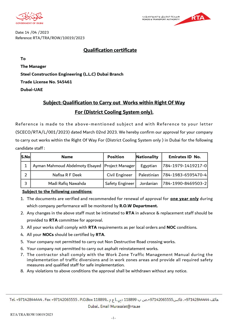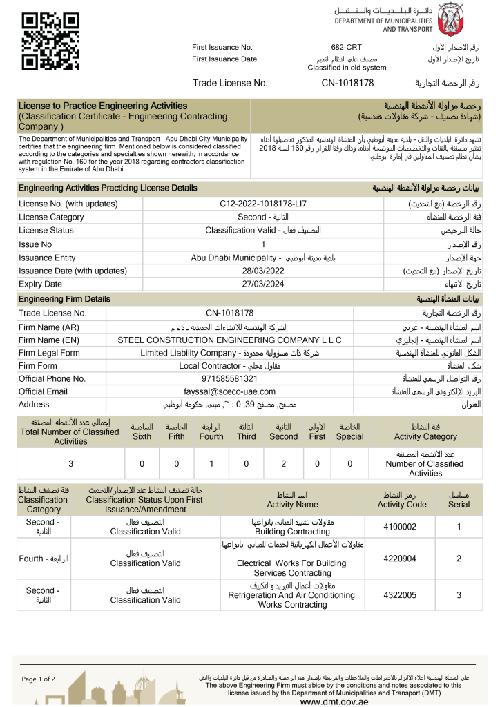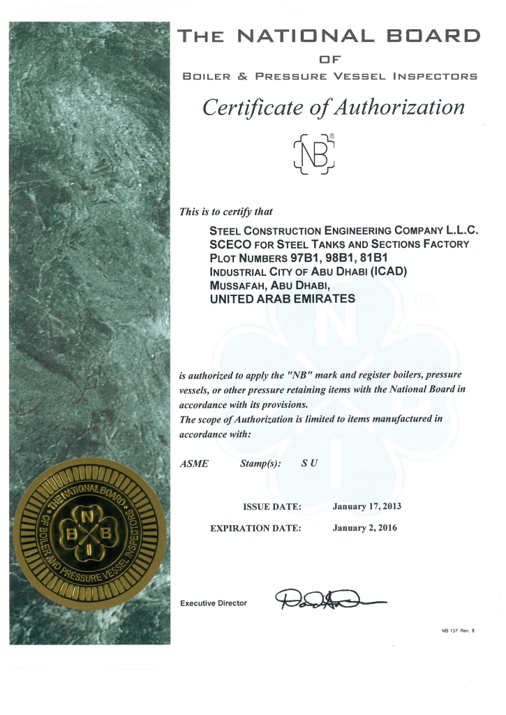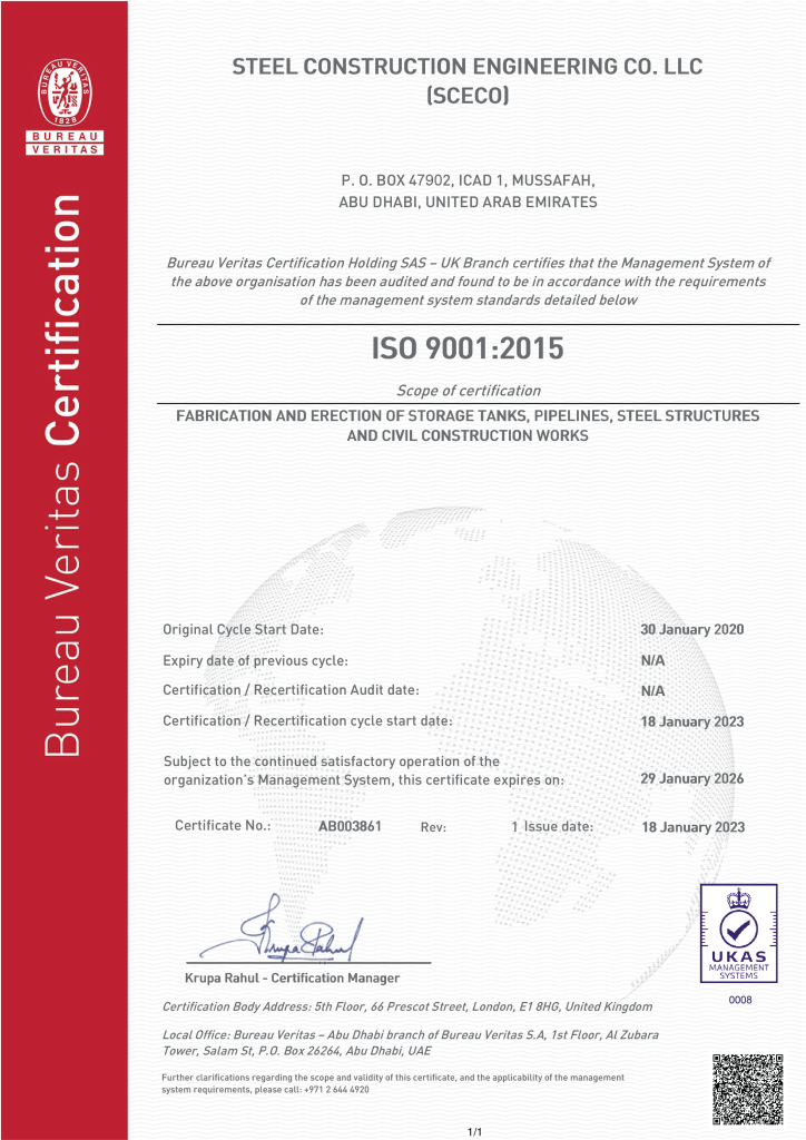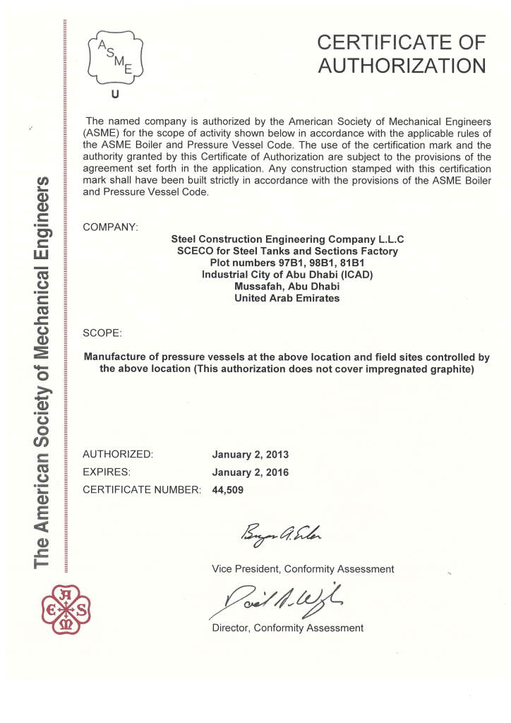 Sceco Certification of Fabrication and Erection of Storage Tanks, Pipelines, Steel Structures, and Civil Construction.